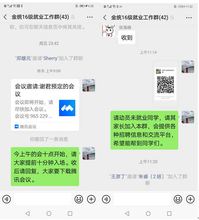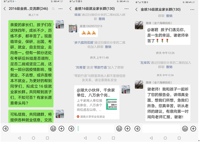 第二,发挥家长的作用,用亲情调动大家。年级建立“金统16级就业家长群”,搭建学校与家庭沟通的桥梁,实现家校联合,为家长了解学校助力毕业生就业的相关政策和平台提供渠道;调动家长的资源,为学生了解就业信息和增加升学机会提供动力。目前年级已有128位家长主动入群,家长与拉斯维加斯 建立了密切的联系,信息畅通,在家长的鼓励与帮助下,很多同学重拾信心,找到方向,投递简历,效果显著。后续,拉斯维加斯 将继续调动家庭这个大后方,动员家长的力量,为同学们的就业提供保障。