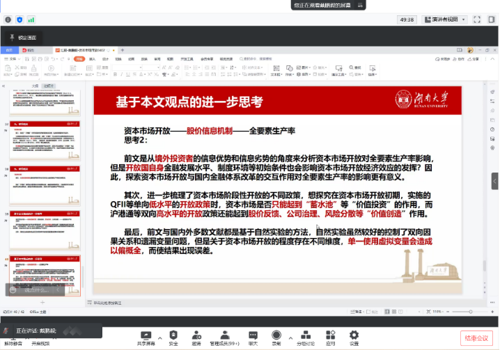讲座伊始,戴鹏毅就其课题研究过程,以我国资本市场的制度变迁史为开端,抛出“请君入瓮还是引狼入室?”的趣味性问题来针对主题研究进展向观众进行矛盾性分析,最后基于背景总结出的三个问题引出了本次活动介绍的研究主题。关于所研究问题,戴鹏毅依托一个“开放”、三个“机制”概括了主题中的影响作用路径,而后重点向观众分享了其在实证研究中的步骤及思考,阐述了其在进行研究过程中的逻辑设计,为研究生提供了相关论文写作的经验。