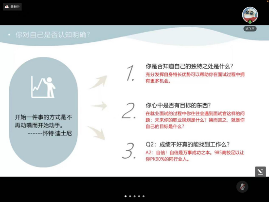 成功应聘华为公司的董婉心学姐主要为同学们介绍了就业信息的收集,分享面试经验及准备。她分享了自己面试华为财经公司的经历,强调一些基础软件,如Python、R的学习掌握了会给面试带来一定优势。其次在简历的准备中要确保内容透彻清楚,体现出能胜任岗位的能力,突出核心竞争力。
