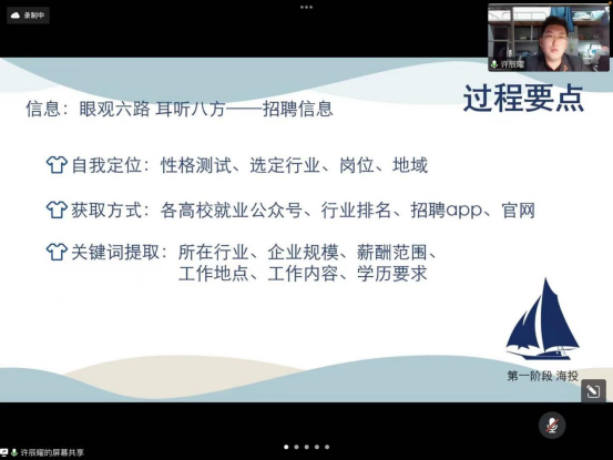 大三即将迎来尾声,为帮助同学们对未来的道路做出正确选择并做好相应准备,拉斯维加斯 本科2019级年级组于5月15日晚19时举办了线上就业经验分享交流会,会议邀请许辰曜、李鹏宇、董婉心、姚飞宇四位成功拿到offer的学长学姐分享自己在求职过程中的心得体会和宝贵经验。此次会议由年级组成员贺陈涵君主持。