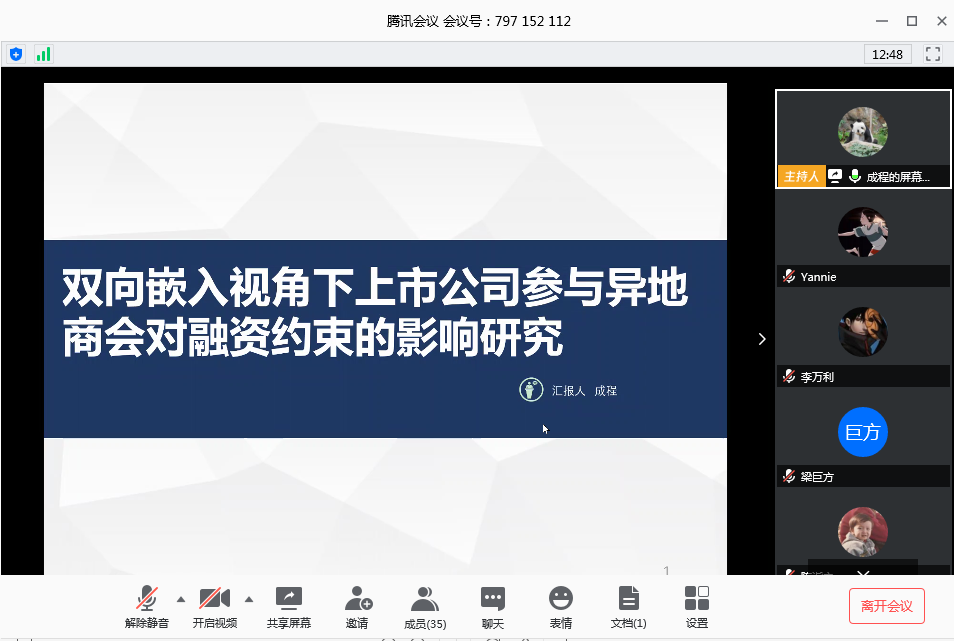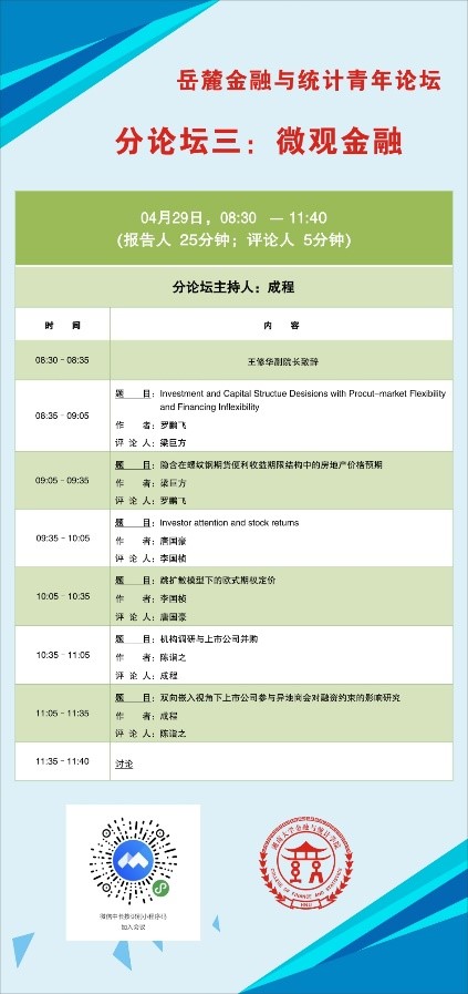 分论坛三由成程助理教授主持,首先是罗鹏飞助理教授汇报《Investment and capital structure decisions with product-market flexibility and financing inflexibility》他研究了具有产品市场灵活性(或市场支配力)和融资灵活性(或债务发行约束-t)的最佳降低成本的投资和资本结构决策。结果表明,产品市场的灵活性对企业的投资和资本结构决策具有重大影响。接下来由梁巨方副教授汇报《隐含在螺纹钢期货便利收益期限结构中的房地产价格预期》,他通过动态Nelson-Siegel模型提取了螺纹钢期货便利收益率的水平、斜率和曲率三因子,并用于解释后期房地产的价格变化和预测房地产价格。接着由唐国豪助理教授汇报《Investor Attention and Stock Returns》,他研究了投资者的注意力是否可以预测总体股票市场。确定了两种可预测性的经济来源:投资者对总体股票市场关注的预测能力主要来自其预测低迷市场收益和坏消息驱动股票收益的能力。李国桢助理教授汇报了《跳扩散模型下的欧式期权定价》,她发现一种通用跳变扩散模型下的欧式期权定价封闭式解决方案,该模型可以合并任意离散的跳变大小分布。陈诣之助理教授汇报了《机构调研与上市企业并购》,他认为机构调研是发挥机构投资者对于企业并购行为监管和约束的有效方式,应鼓励和加强机构投资者利用调研的方式对于企业并购行为进行合理、有效的监督。成程助理教授汇报了《 双向嵌入视角下上市公司参与异地商会对融资约束的影响研究》,他通过分析异地商会双向嵌入的社会属性和现实功能出发,将2008—2018上市公司高管向异地商会捐款和担任异地商会职务的数据与上市公司财务数据进行匹配,验证了上市公司参加商会对公司融资约束的影响。