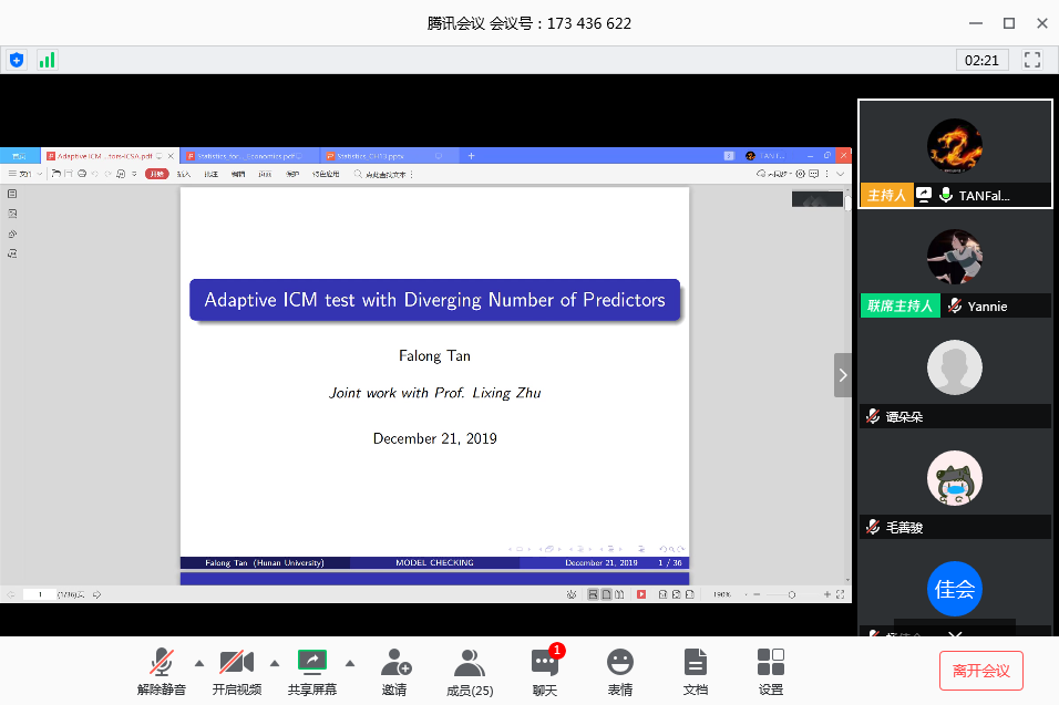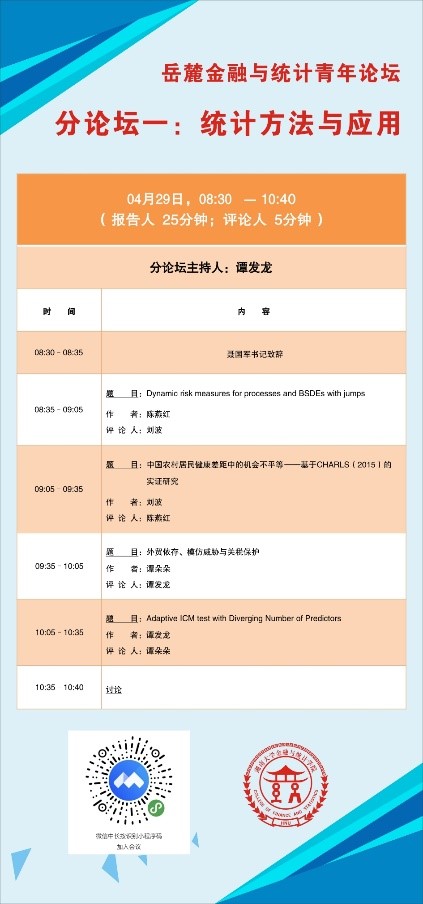 分论坛一由谭发龙副教授主持,首先是陈燕红助理教授汇报《Dynamic risk measures for processes and BSDEs with jumps》,她使用带跳倒向随机微分方程来研究过程的动态风险度量,研究了带跳的倒向随机微分方程的生成元与其诱导的动态风险度量之间的一一对应关系,得到带跳倒向随机微分方程生成元的表示定理以及由其诱导的动态风险度量的表示定理;接下来由刘波博士后汇报《农村居民健康差距中的机会不平等——基于CHARLS(2015)的实证研究》,他以“中国健康与养老追踪调查(2015)”中的农村居民为样本,结合样本数据测度农村居民健康差距中的机会不平等。从提升国民健康素养、增加医疗基础设施建设与阻断健康差距的代际传递提出政策建议。谭朵朵副教授汇报了《外贸依存、模仿威胁与关税保护》,她创新地从进口国视角,构建了模仿威胁通过外贸依存度对关税保护造成影响的理论体系,并考虑模仿威胁分类特点并认为其可能存在调节作用,通过调节中介效应模型证明外贸依存存在中介效应且模仿威胁存在调节作用。最后由谭发龙副教授汇报《Adaptive ICM test with Diverging Number of Predictors》,他研究发现积分条件矩检验在高维时完全失效,针对参数多指标模型,提出了投影自适应版本的高维积分条件矩检验,进一步得到了这一新方法在原假设和备择假设下的渐近分布。数值模拟的结果表明这一新的检验方法在高维时能够极大的避免“维数祸根”问题。