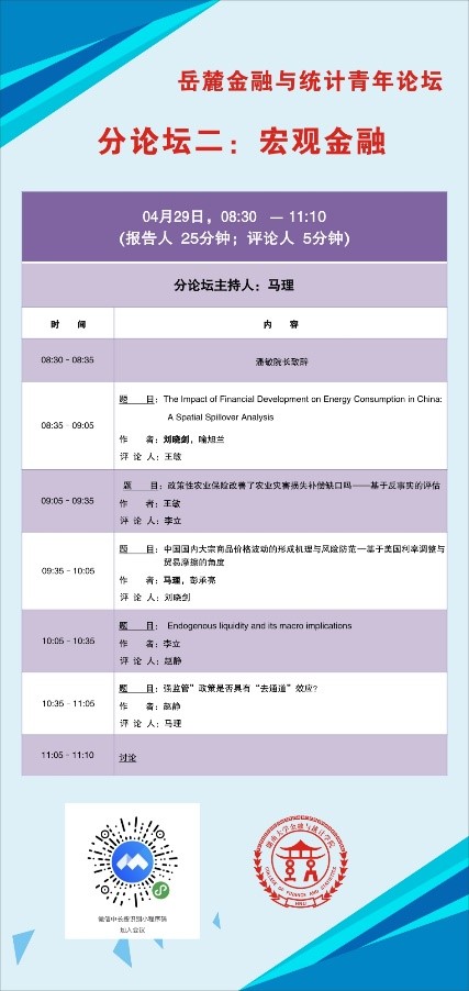 分论坛二由马理教授主持,首先是刘晓剑助理教授汇报《金融发展对中国能源消费的影响:空间溢出分析》,文章基于空间计量模型,以中国2005-2017年30个省的相关数据为样本,从间接融资、直接融资和金融开放三个角度研究了金融发展对能源消费的影响。王敏助理教授汇报《政策性农业保险改善了农业灾害损失补偿缺口吗?——基于反事实的评估》,研究发现,实验组五省(区)在2004-2006年间,政府未干预农业保险下农村自然灾害补偿缺口与政府干预农业保险后农村自然灾害补偿存在的缺口的差值大部分为正值,说明农业保险政策效应明显与中央财政补贴力度有关,实行政策性农业保险对缩小农业灾害损失补偿缺口的有积极显著影响。马理教授汇报了《中国国内大宗商品价格波动的形成机理与风险防范——基于美国利率调整与贸易摩擦的视角》,他构建理论模型分析了中国国内大宗商品价格波动的形成机理,检验了美国利率调整与贸易摩擦对于中国国内大宗商品价格的影响,并使用套期保值的技术方法防范中国国内大宗商品价格的波动风险。得出三点结论并提出相应的政策建议。李立助理教授汇报了《Endogenous liquidity and its macro implications》,他研究了金融市场中的内生的流动性和脆弱性及其宏观影响。主要包括金融市场上证券的流动性的内在决定因素和由于证券的内生流动性造成的宏观脆弱性。赵静助理教授汇报了《“强监管”政策是否具有“去通道”效应?》她将银行、信托、证券和保险公司纳入统一的框架,把CoVaR与LASSO相结合,构建我国金融机构间的联系网络,分析“强监管”政策对银行风险网络关联度的影响和作用机制。