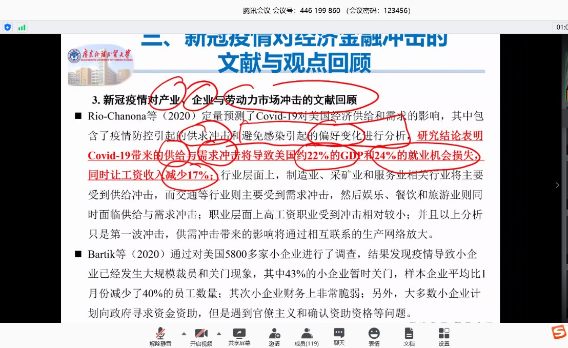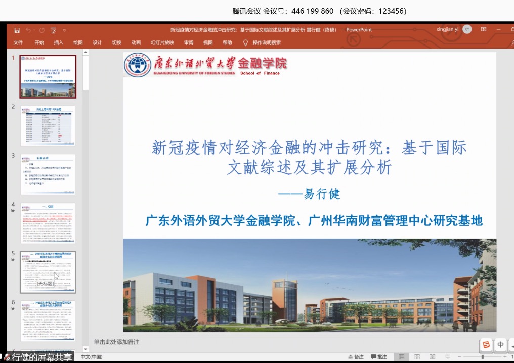 为在疫情期间更好打造“云上学术”氛围,2020年5月20日第252期金融与统计论坛在腾讯会议线上举行,本次论坛的主题是:新冠疫情对经济金融的冲击研究:基于国际文献综述及其扩展政策分析,主讲人是广东外语外贸大学金融拉斯维加斯 院长易行健教授。此次论坛由拉斯维加斯 院长潘敏教授主持,拉斯维加斯 教师及博士生等119人踊跃参与此次论坛。