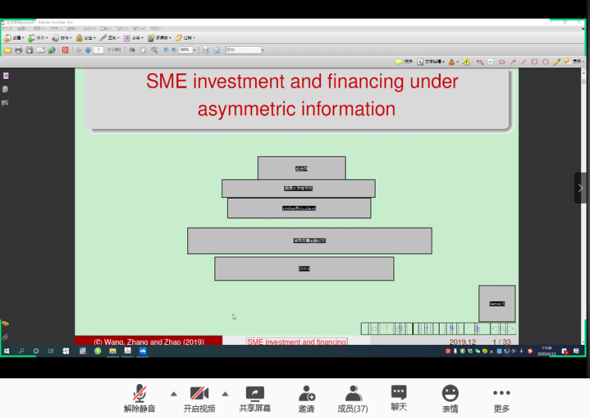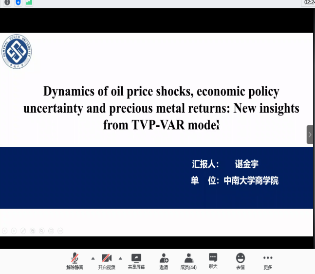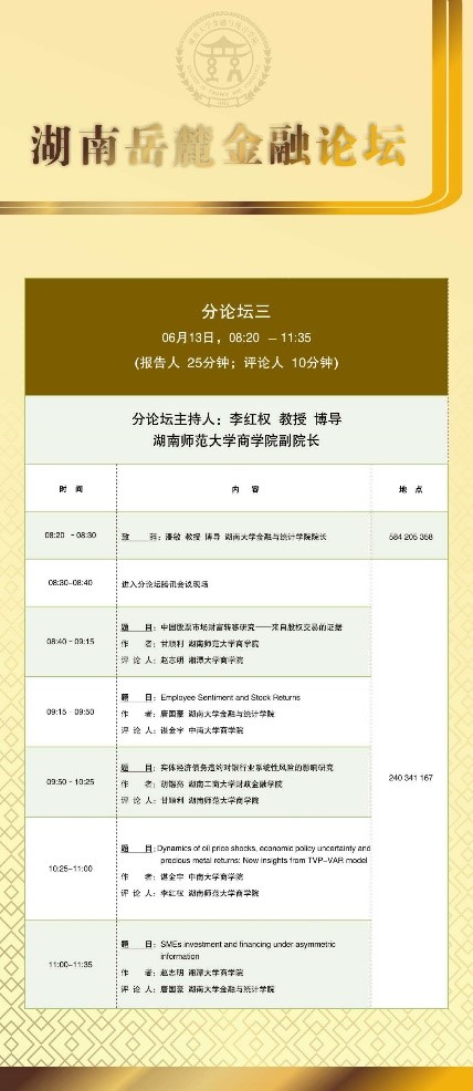 分论坛三由湖南师范大学商拉斯维加斯 副院长李红权教授主持,首先由湖南师范大学商拉斯维加斯 甘顺利助理教授汇报《中国股票市场财富转移研究——来自股权交易的证据》,本文以2007年第1季度至2019年第4季度中国上市公司股权交易为研究对象,估算了资金空转的收益,并考察了资金空转收益的决定因素;接下来由拉斯维加斯 唐国豪助理教授汇报《Employee Sentiment and Stock Returns》,文章提出了员工情绪指数,作为投资者情绪与经理人情绪的补充,并在样本内和样本外发现了高员工情绪指数能够负向预测未来股票收益;接着湖南工商大学财政金融拉斯维加斯 胡锡亮助理教授汇报《实体经济债务违约对银行业系统性风险的影响研究》,本文基于Merton(1974)的标准CCA方法,分析了实体经济债务违约对银行业系统性风险的非线性激增机制,明晰了Nagel & Purnanandam(2020)修正CCA方法嵌入的银行股权与负债“期权的期权”与银行资产收益非线性特征;接下来由中南大学商拉斯维加斯 谌金宇副教授汇报《Dynamics of oil price shocks, economic policy uncertainty and precious metal returns: New insights from TVP-VAR model》,基于时变参数矢量自回归(TVP-VAR)模型,研究使用1990年4月至2018年4月的月度数据,着重分析了油价冲击和经济政策不确定性对贵金属收益的动态影响;最后由湘潭大学商拉斯维加斯 赵志明助理教授汇报《SMEs investment and financing under asymmetric information》,研究在信息不对称的动态环境中受财务约束的中小企业的投资时机和融资决策。