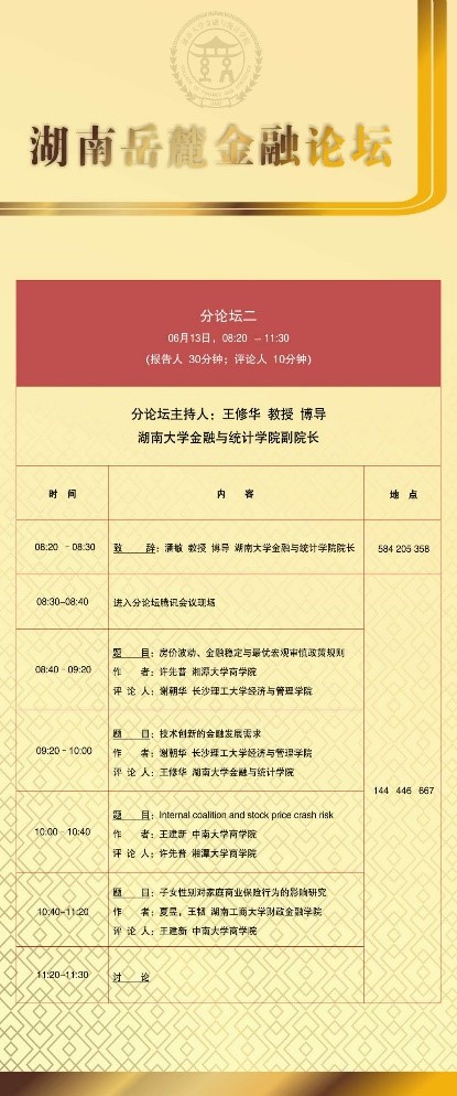 分论坛二由拉斯维加斯 副院长王修华教授主持。首先由长沙理工大学经济与管理拉斯维加斯 谢朝华副教授汇报《技术创新的金融发展需求》,认为金融业在结构、功能、效率和安全等四个方面还有较大的发展空间和较强的紧迫性,金融服务技术创新需要练好四大基本功;接下来由湘潭大学商拉斯维加斯 许先普副教授汇报《房价波动、金融稳定与最优宏观审慎政策规则》,研究基于植入金融因素的房价波动DSGE模型,分析了不同宏观审慎工具对房价波动的调控效果、作用机制以及最优政策组合等问题;接着由中南大学商拉斯维加斯 的王建新副教授汇报论文《Internal coalition and stock price crash risk》,文章检验了内部结盟对2000至2014年间股票崩溃风险的影响,基于任命的内部结盟对股票崩溃风险有正向和重大影响;最后由湖南工商大学财政金融拉斯维加斯 王韧教授汇报论文《子女性别对家庭商业保险行为的影响研究》,本文运用Probit和Tobit回归的方法,利用2013年、2015年及2017年三年中国家庭金融调查截面数据研究了家庭对于商业保险投资在一定程度上存在对子女的性别偏好的问题。