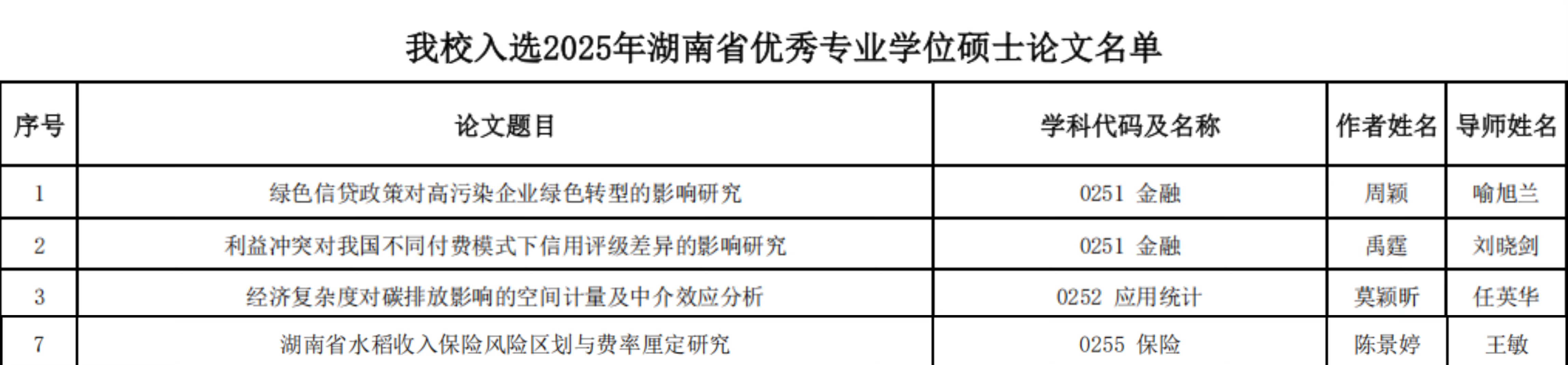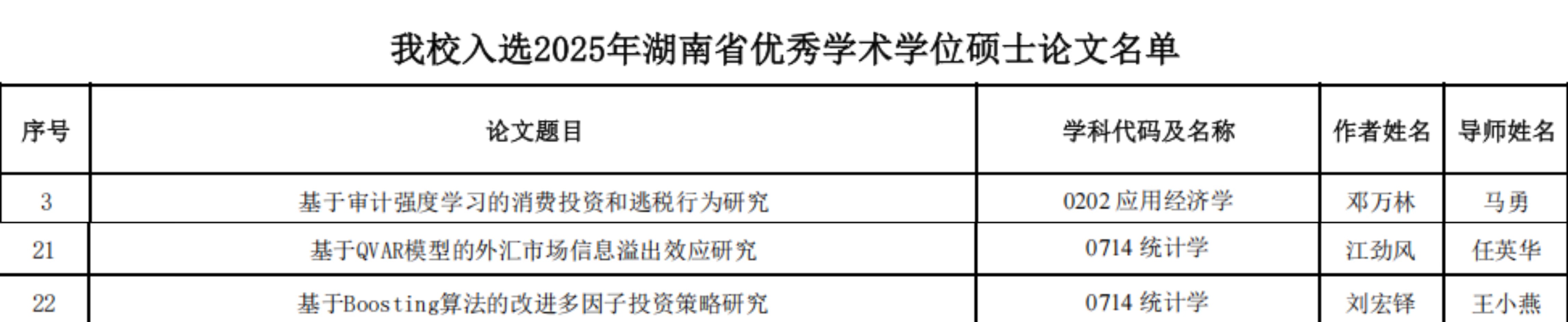 近日,湖南省教育厅公布了2025年湖南省优秀硕士学位论文名单,拉斯维加斯 共有7篇论文入选湖南省优秀硕士学位论文,这7篇论文分别由拉斯维加斯 马勇老师、任英华老师、王小燕老师、喻旭兰老师、刘晓剑老师、王敏老师指导。