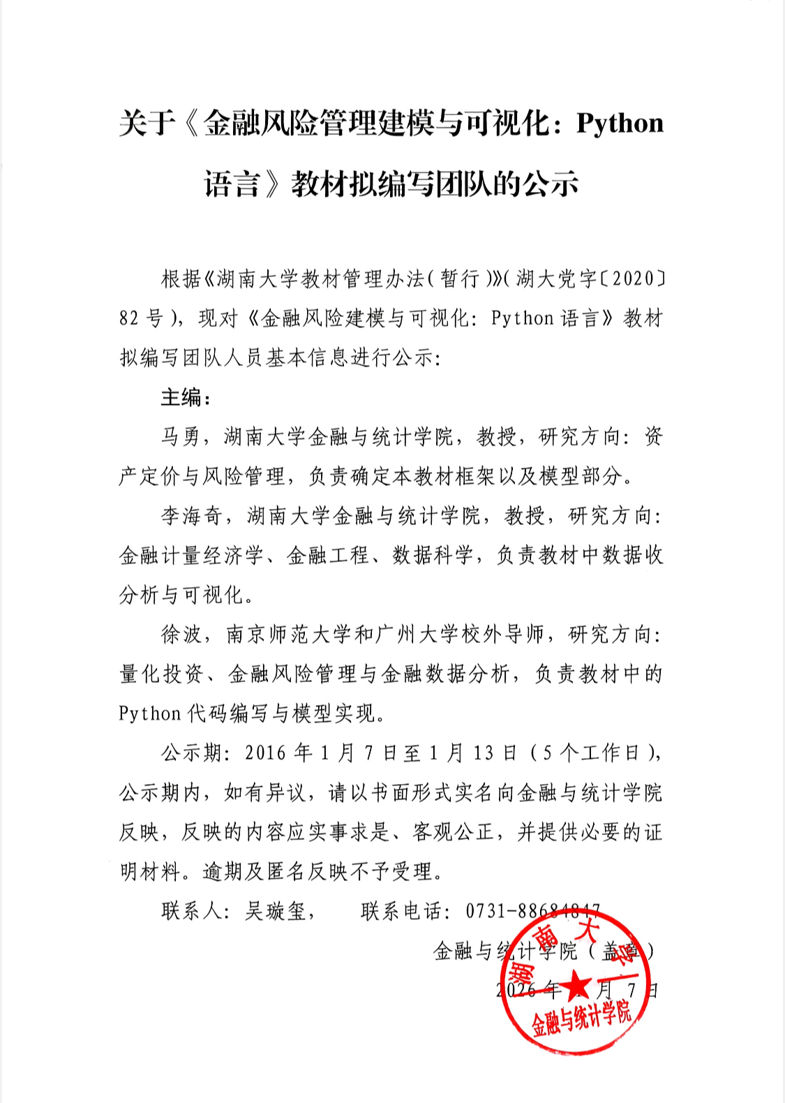 关于《金融风险管理建模与可视化:Python语言》教材拟编写团队的公示